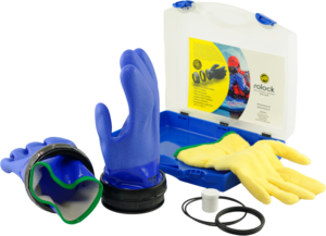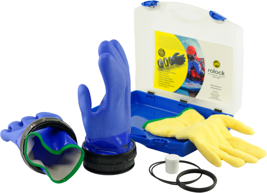 Komplettes, vormontiertes Set mit blauen Handschuhen mit seperatem Innenfutter mit O-Ringen und Silikonpflegemittel.